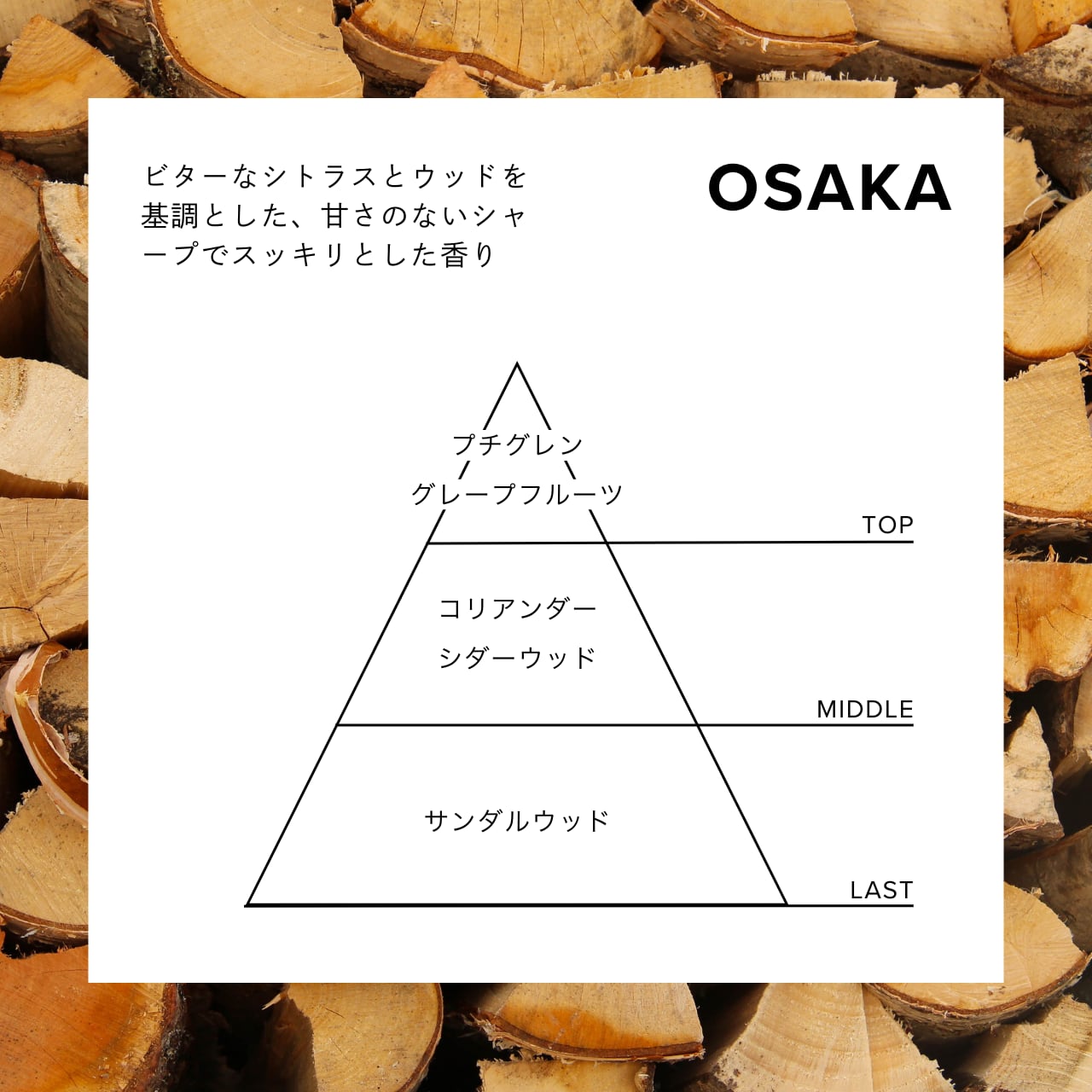 プチグレンやグレープフルーツのビターなシトラスとウッドを基調とした、甘さのないスッキリとした香り。香りのキレがよく、シーンを問わず使えます。